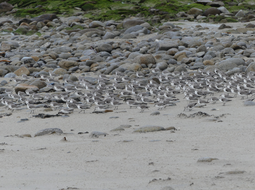 Les bécasseaux sanderlings étaient plus de 250 ce matin sur la grève blanche et trois autres groupes ont pu être observés sur d’autres sites du littoral Nord de l’île de Batz. Les trois centaines ont été dépassés mais le record de l’été dernier, 650 sur la grève blanche, est loin d’être atteint. Néanmoins, l’île de Batz est la commune du Finistère qui cumule le plus d’observations et d’effectifs de l’espèce depuis le début du mois.