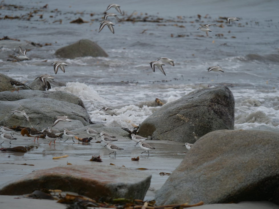Le nombre d’espèces d’oiseaux limicoles était élevé ce matin : chevalier gambette et grand gravelot dans le port mais surtout des groupes de tournepierres à collier et bécasseaux sanderlings sur le littoral Nord. Sur la grève blanche, ce sont les huîtriers pie, courlis cendrés, pluviers argentés et un bécasseau variable qui étaient observables.