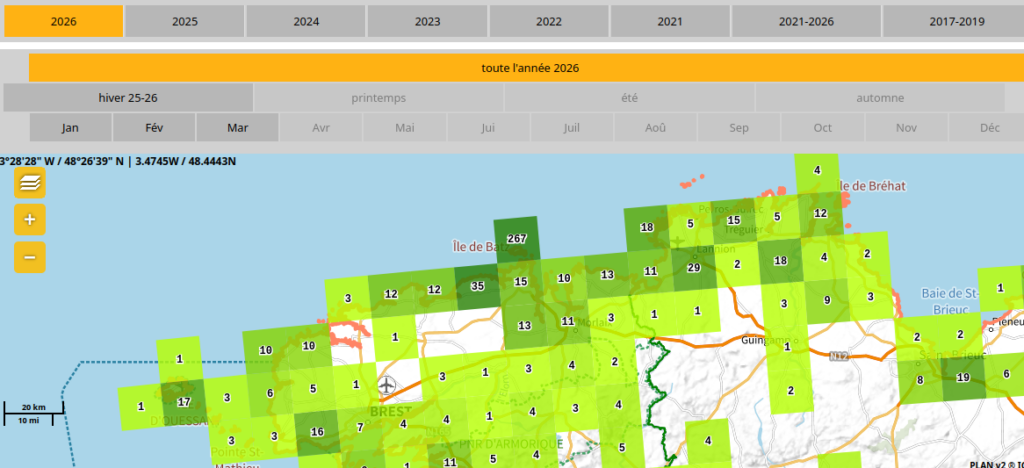 Paramètres de l’observation : vent de Sud 45 km/h – température 13° – couvert – marée basse coefficient 23 – température de la mer 11,3°.