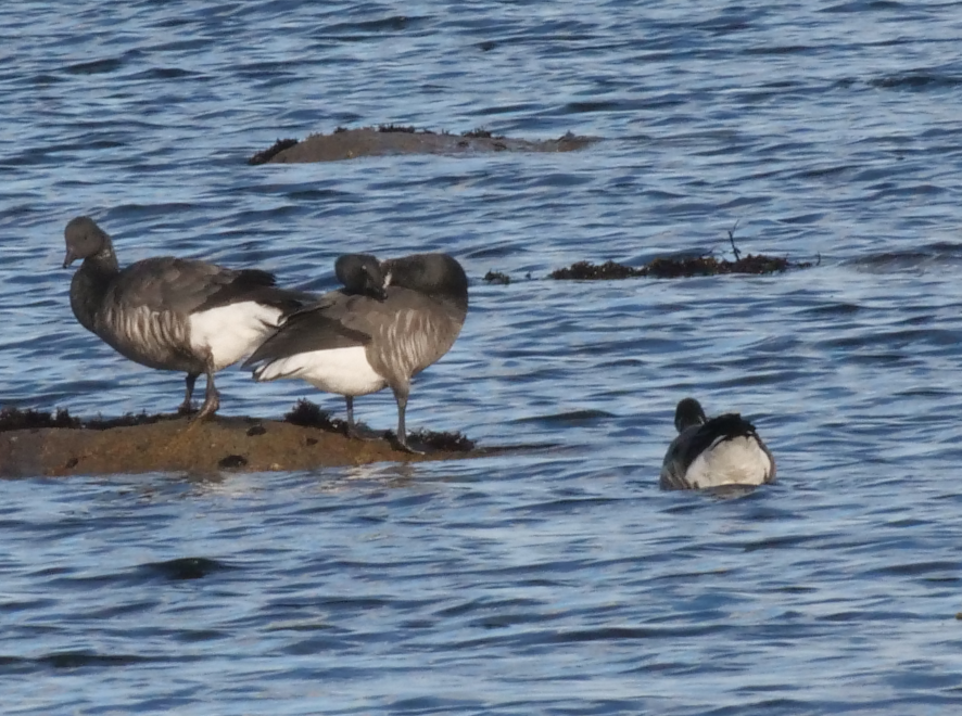 Ce matin, les bécasseaux sanderlings étaient les plus nombreux des oiseaux fréquentant la grève blanche. Le groupe d’une cinquantaine était complété par un bécasseau variable, deux barges rousses, deux courlis cendrés, trois huîtriers pie et trois pluviers argentés.