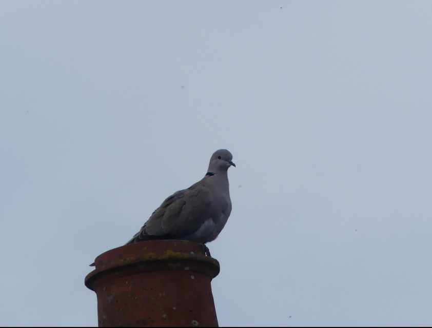 Ce matin, c’est dans le quartier du Rhû qu’une tourterelle turque était présente sur une cheminée et à proximité de pigeons ramiers et de pies bavardes.