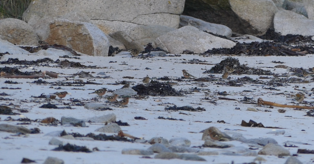 Ce matin, la grève blanche et la plage de Porz Melloc étaient fréquentées par une quarantaine de pinsons des arbres. Ils y sont depuis plusieurs semaines mais l’effectif n’a jamais été aussi élevé.